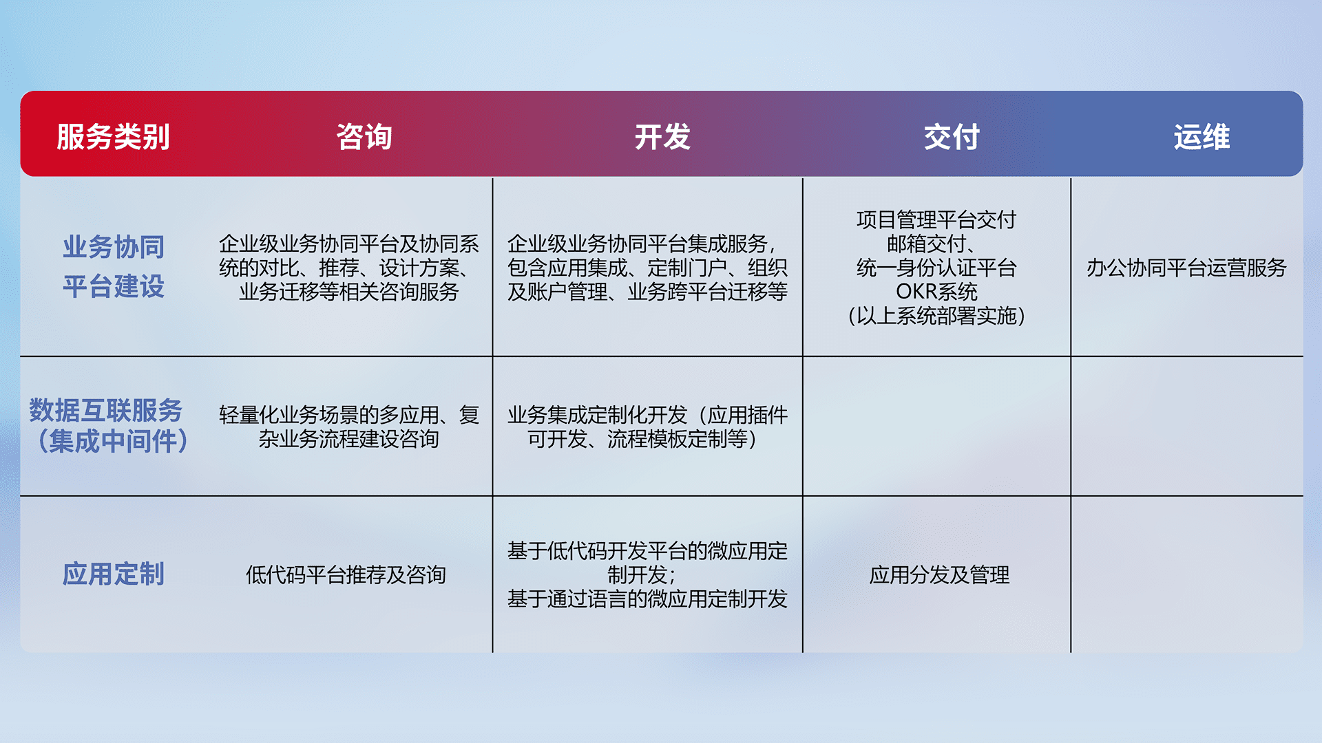 针对钉钉、、、、企微、、、IDaas等平台级产品提供产品的规划、、、方案、、交付、、定制化开发等服务,,实现如统一协同办公、、智能客户服务、、混合会议管理、、智能数据查询、、、等业务场景,,,,实现数字化转型。。。